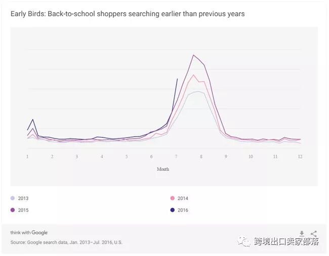 据Google的搜索数据显示,近几年来,6月底和7月初关于“返校”搜索查询量都在增加,而且每年搜索量上升的时间都在提早,并会在7月11日当周开始出现强劲增长,这可能与邻近亚马逊 Prime Day销售有关。