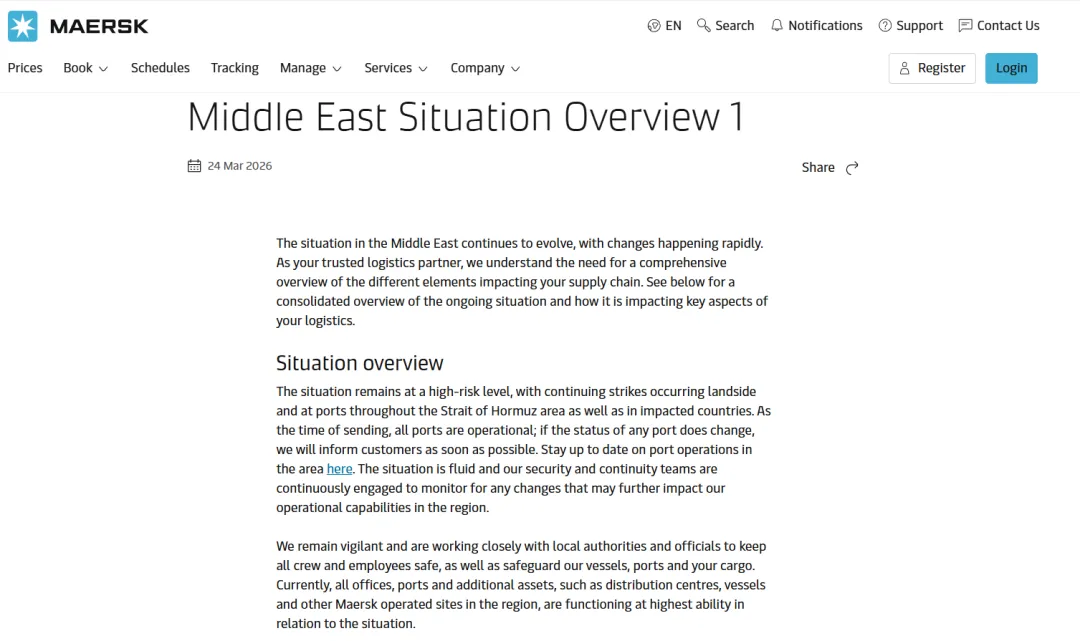 运营层面,马士基已全面收缩波斯湾北部业务:暂停阿联酋、卡塔尔、科威特等多地订舱,仅对食品、药品等必需品和少数特定港口保留例外。同时,马士基正扩大陆桥运输、增加航空货运依赖,以此绕过海上瓶颈,保障货物运输。