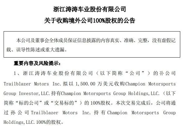 12月16日,浙江涛涛车业股份有限公司(以下简称“涛涛车业”)发布一份新公告,内容关于收购境外公司100%股权。