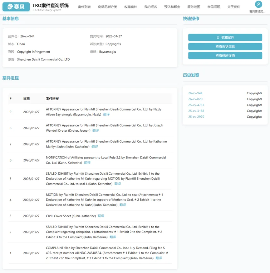 从赛贝TRO案件查询系统获悉,2026年1月27日,Bayramoglu律所代理dresslily女装品牌上千张商品图版权进行TRO维权,原告企业品牌网站是专注于时尚服装和相关配饰的线上商城,商品主要覆盖欧美市场。由于版权是隐匿状态,原告的商品图都不可使用,大概率都会构成侵权行为!