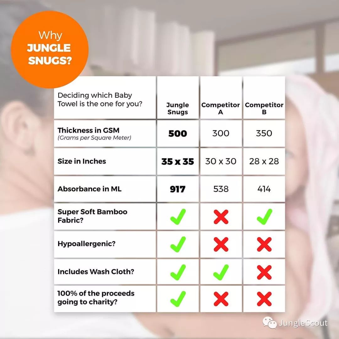 谈完了产品应用场景图,最后让我们来谈谈如何打造抓取消费者眼球的产品图片。一开始各位卖家就需要明确的是产品的目标群体、理想的展示产品的场景、以及和竞争对手相比产品的优势在哪。同样是拿之前的Jungle Snugs举例: