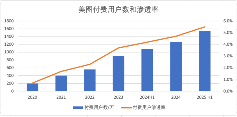 相比 MAU 相对稳健的增长,美图在付费用户数和付费渗透率方面的增长就快很多了。2025 年上半年,美图付费用户数 1540 万,增长 42%,付费渗透率 5.5%。此前美图 CEO 吴欣鸿曾表示,美图最初制定的付费渗透率目标是 5%,现在看来是有些保守了。