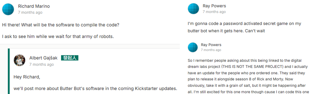 从评论区来看,很多支持者也是因为这一功能支持了 Butter Bot 的众筹项目。目前,Butter Bot 已发布公告,称将在 9 月开始发货。