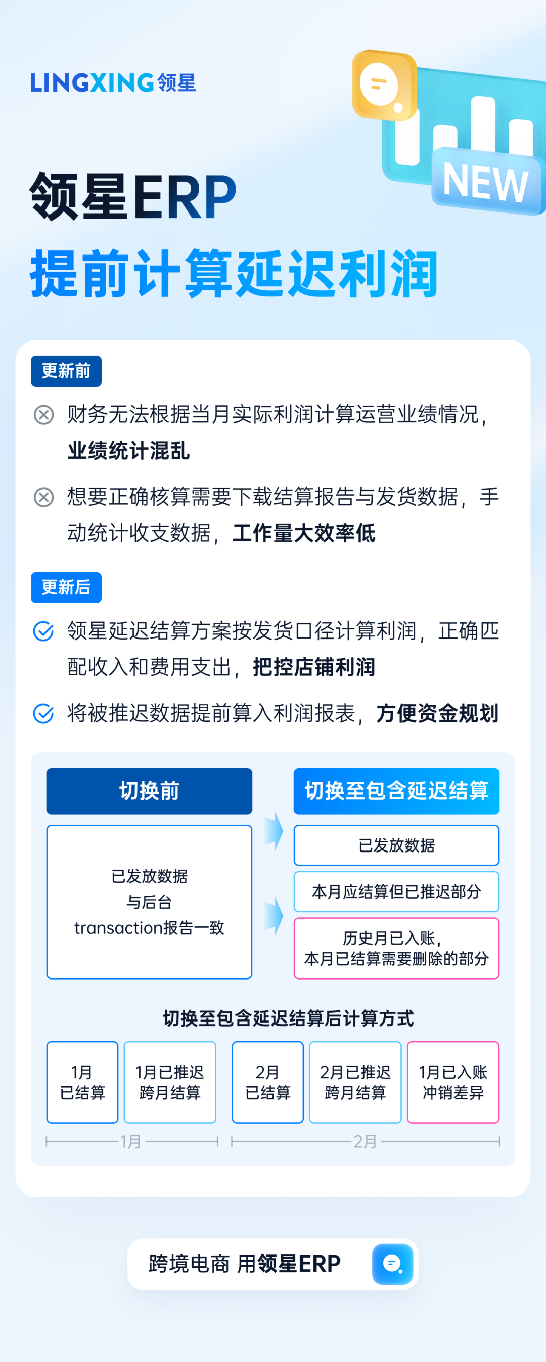 领星准确观察到跨境卖家这一业务痛点,更新了延迟结算解决方案助力卖家精准核算利润。领星延迟结算方案会按发货口径计算店铺利润,正确匹配收入和费用支出,并将被推迟数据提前算入利润报表,方便跨境卖家做好资金规划。