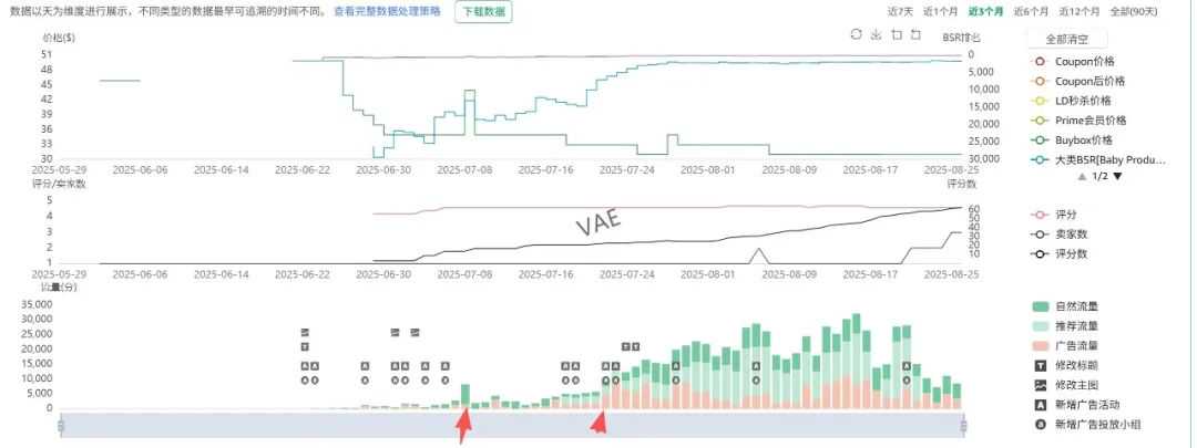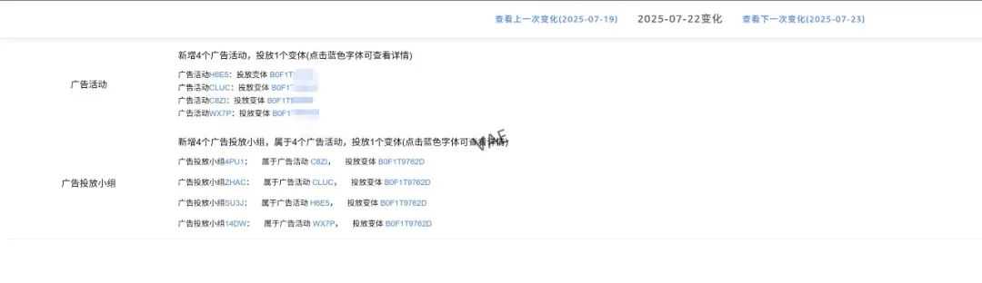 上图最吸引我的有两个时间节点,分别是7月8日和7月22日这两个时间节点。因为这里面的流量相较于日前形成了一个流量高峰(流量反应销量),解剖竞品的操作方法,对于经验的可复制有一定的参考作用。而且比起产品后期的分析,在新品前期动作的溯源尤其重要。特别是7月22日这个时间节点,整体流量得到上升的同时,竞品也新增了广告活动,那么可以进一步评估这个广告活动的有效性。
