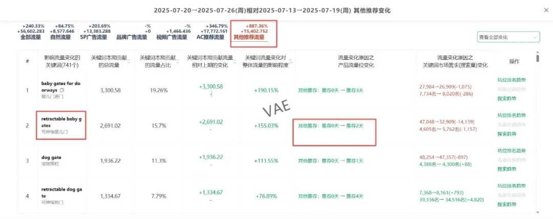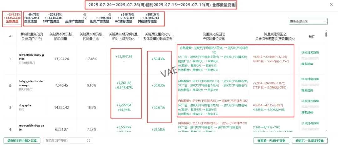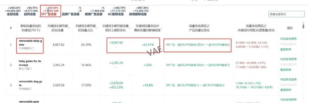 1. retractable baby gates这个词是最重要的流量增长来源,上一期该词是没有贡献流量的,这一期流量贡献值上涨到13997.26。可以针对该词流量增长的来源进行拆分,划分为自然流量\广告流量\品牌广告流量\视频广告流量\AC 推荐流量\其它推荐流量。我们要分析词增长的因素就是要找到变量,那么根据上述信息我们就可以找出该产品最大流量增长点的关键词retractable baby gates流量上涨的来源是哪个部分造成的(这个就不一一截图了,从数据来看retractable baby gates除了品牌广告流量之外,其它流量都有一定程度增长,增长的数值也是差不多)
