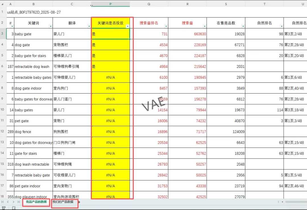 这里可以根据流量进行降序,查看竞品有哪些的流量词,并且和我们自己的流量词进行比较。如果信息完全匹配了,说明这个词我们已经投放了。但是我们更应该去关注哪些竞品有但我们没有的流量词,可以拎这些词出来做投放的筛选。