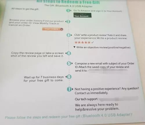 而引发外媒质疑的,则是包裹中附带的“感谢卡”。据了解,这款耳机到货时附有一张卡片,鼓励客户通过发布Review以换取免费的USB适配器。外媒认为这一操作违反了亚马逊的相关指导规定,即不可以以任何形式的补偿(包括免费礼品或产品折扣)引导客户创建、修改或发布Review内容。