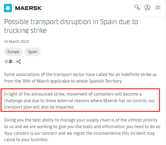 西班牙交通部的几个协会呼吁从3月14日起在该国全境实施无限期罢工。马士基发布公告称,罢工将使集装箱运输成为一项挑战,由于无法控制的外部原因,运输将受到影响,货物派送都会有不同程度延误。