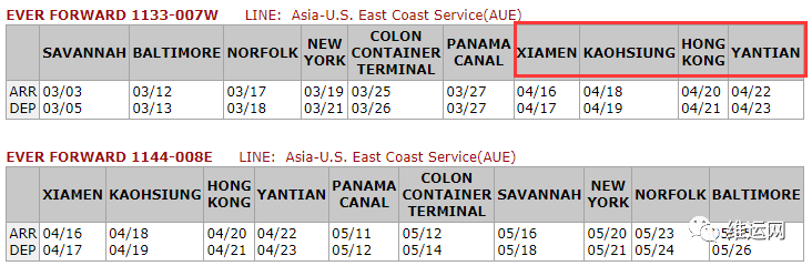 据了解,“Ever Forward”主要负责长荣的亚洲往返美东AUE航线,事发时执行1133-007W航次。共舱的船公司有EMC、CMA、COSCO、OOCL等。该轮挂靠中国厦门、盐田、香港、高雄港等。