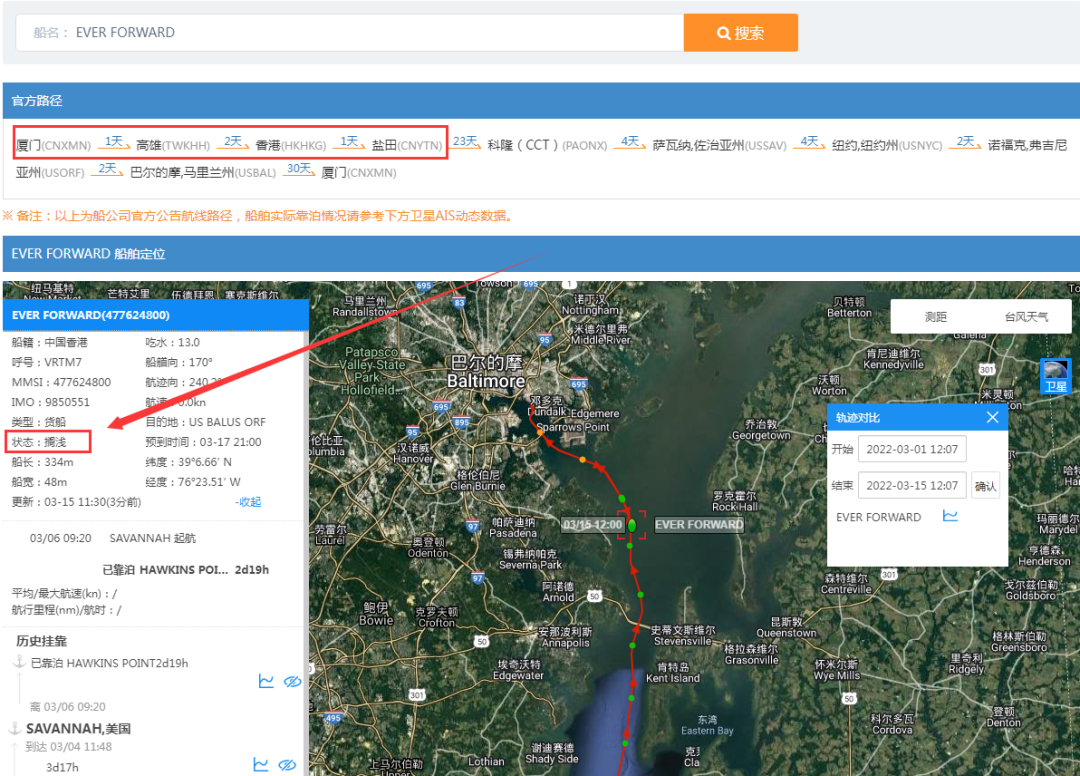 根据最新船舶数据,截至目前3月15日,该船仍搁浅在美国巴尔的摩港附近,预计原定船期将延误。