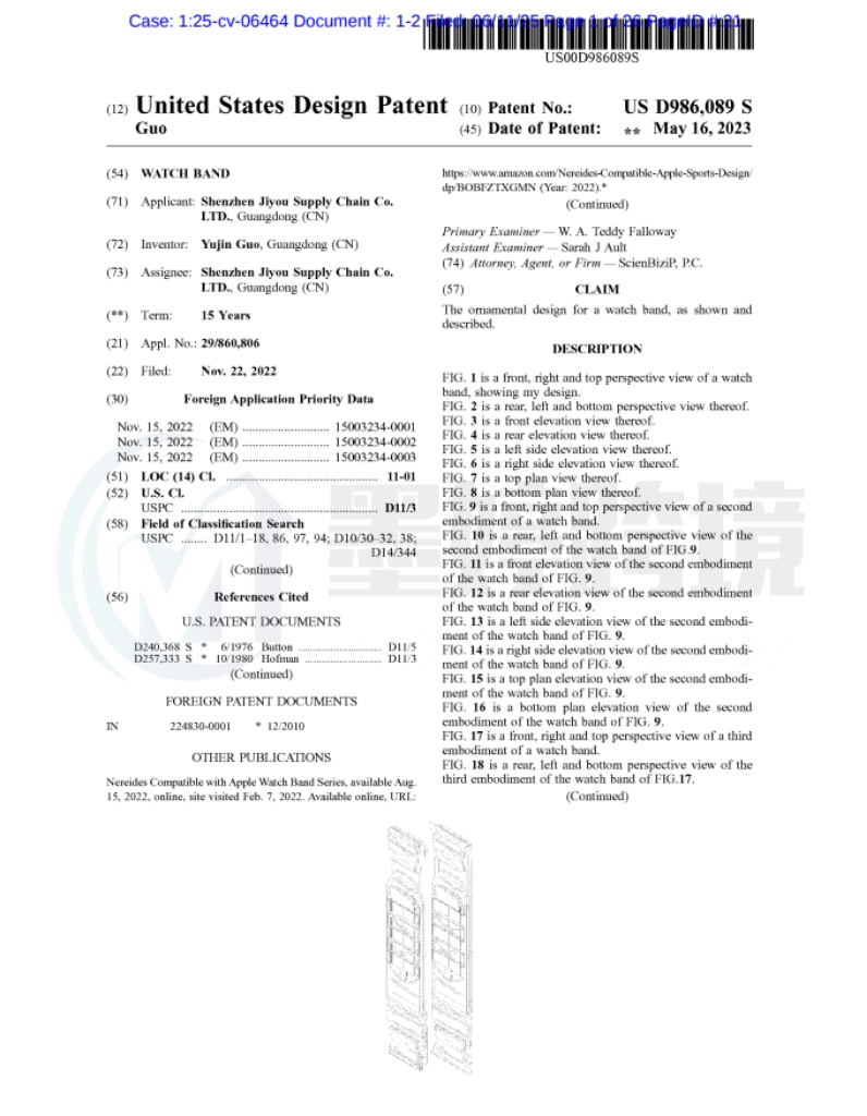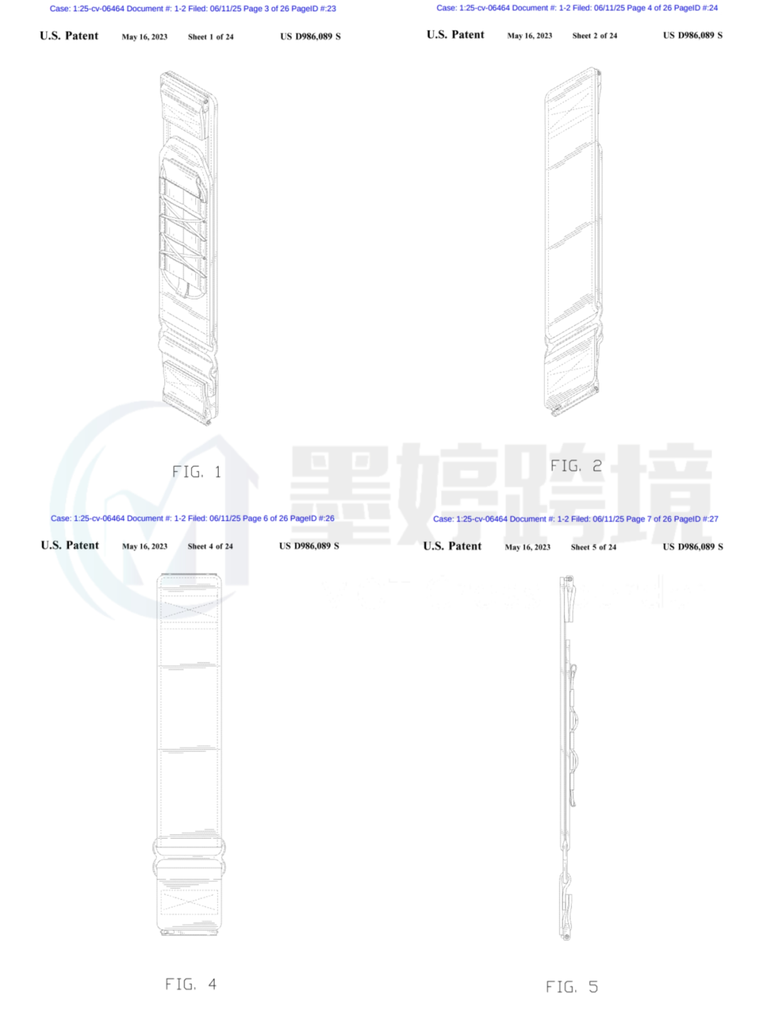 本案为专利侵权,涉及原告旗下1项美国外观设计专利,专利号:US D986,089 S,于2023年5月16日下证;