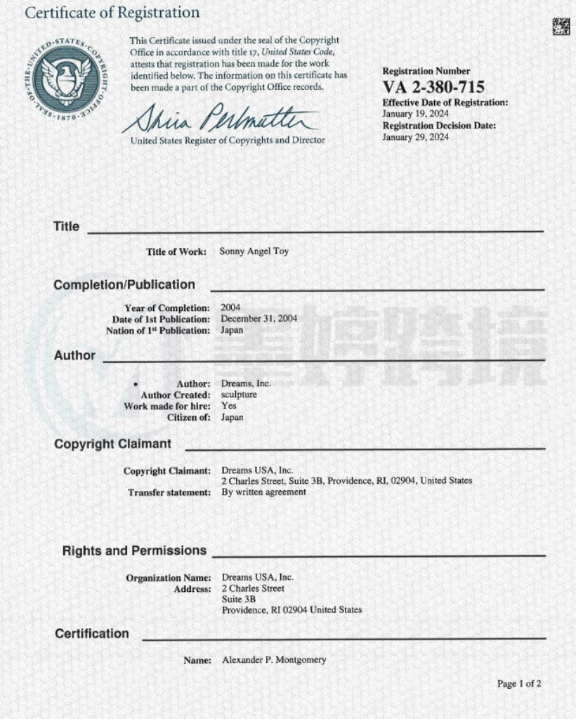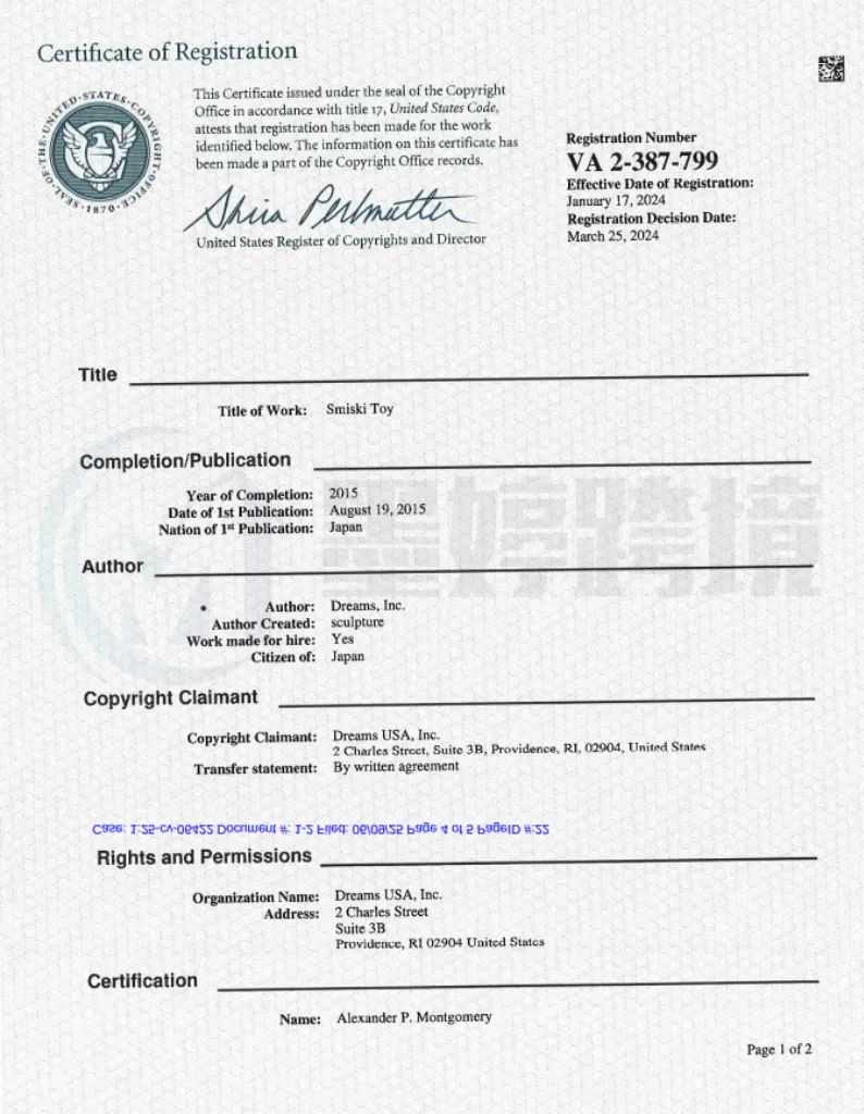 Dreams Inc. 及其美国子公司 Dreams USA, Inc. 已为旗下系列在美国完成版权登记及商标注册,近期也通过律师事务所对侵权产品发起版权诉讼、TRO临时禁令等维权行动。