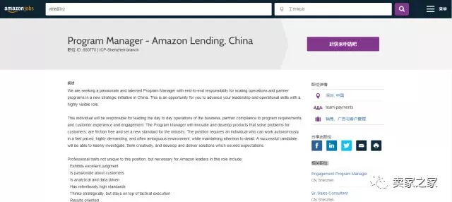 6月19日,亚马逊在其官方招聘网站上发出一则招聘项目经理人的招聘信息。 该招聘信息显示,该工作岗位设在深圳,工作内容是负责在中国的新战略计划中扩大运营和合作伙伴计划的端对端责任。 而在基本任职资格一栏可以看出,该职位要求申请人中英文流利,此外,申请者需要具备商业背景学历,以及一些项目管理或运营经验,并且要具备金融产品、消费者信贷或中小企业融资背景。 该招聘信息中要求申请者具有金融产品、消费者信贷或中小企业融资背景表明亚马逊或准备在中国推出其小微企业贷款业务。 目前中国是全球最大的电商市场,去年中国消费者在线消费金额是美国的两倍,达到了1.1万亿美元之多,与2016年相比增长了32%,各大电商都争相进入中国市场。 亚马逊进入中国市场已十多年,但其在华业务一直得不到突破。艾瑞咨询(iResearch)公布的数据显示,迄今为止亚马逊所占据的份额仍然不到2%。近几年阿里巴巴和京东等本土电商的飞速发展,是亚马逊在华业务得不到突破性发展的阻力。 亚马逊迅速采取此措施,猜测是因为上周搜索巨头谷歌入股京东5.5亿美元,引起了亚马逊的警觉,所以亚马逊试图通过在华开展中小企业信贷业务,来促进其在华市场发展的大飞跃。 亚马逊早在2011年起,亚马逊开始向中小企业开展信贷业务,并且在2015年宣布会将贷款项目扩大至中国及其他七个国家,但据该公司在两年以后发布的一份新闻稿显示,实际上该公司仅在美国、日本和英国发放了贷款,并没有在中国开展此业务。 该项服务或许与上周亚马逊推出的官方收款服务相关,把此项服务和官方收款服务结合,加大中国卖家对亚马逊电商平台的使用。在给中国卖家提供便利的同时,也促进其这部分业务的发展。 此外,猜想亚马逊此项服务可能会推出一些解决中小卖家现金流短缺问题的服务,如在现在半个月打一次款的基础上,缩短打款时间;以及可能会根据卖家的流水额度来提供免抵押贷款服务等。 (卖家之家原创/作者:韩真静) 原创声明:本文首发于卖家之家网站(MJZJ.COM)并由卖家之家作者原创和编辑,转载本文不得修改标题及原文,并保留来源以及原文链接,否则我们将保留追索权利。