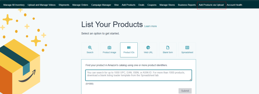 ①进入目标站点后台,使用"Add Products via Upload"功能直接跟卖原有ASIN(如果ASIN已存在目标站点)
