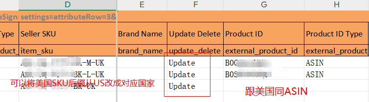 ②或下载产品类目模板,填写与美国站一样的ASIN信息(确保全球商品编码一致),上传时选择"Update"。