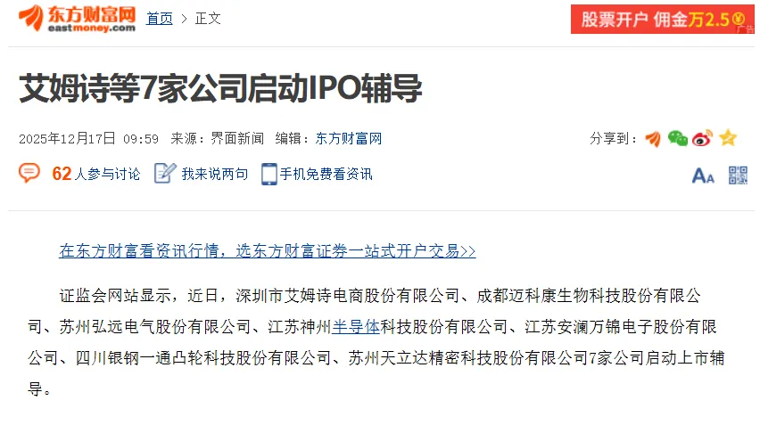 近日,深圳市艾姆诗电商股份有限公司已启动IPO辅导程序,这家成立于2007年的企业,终于走到了资本市场的门前。