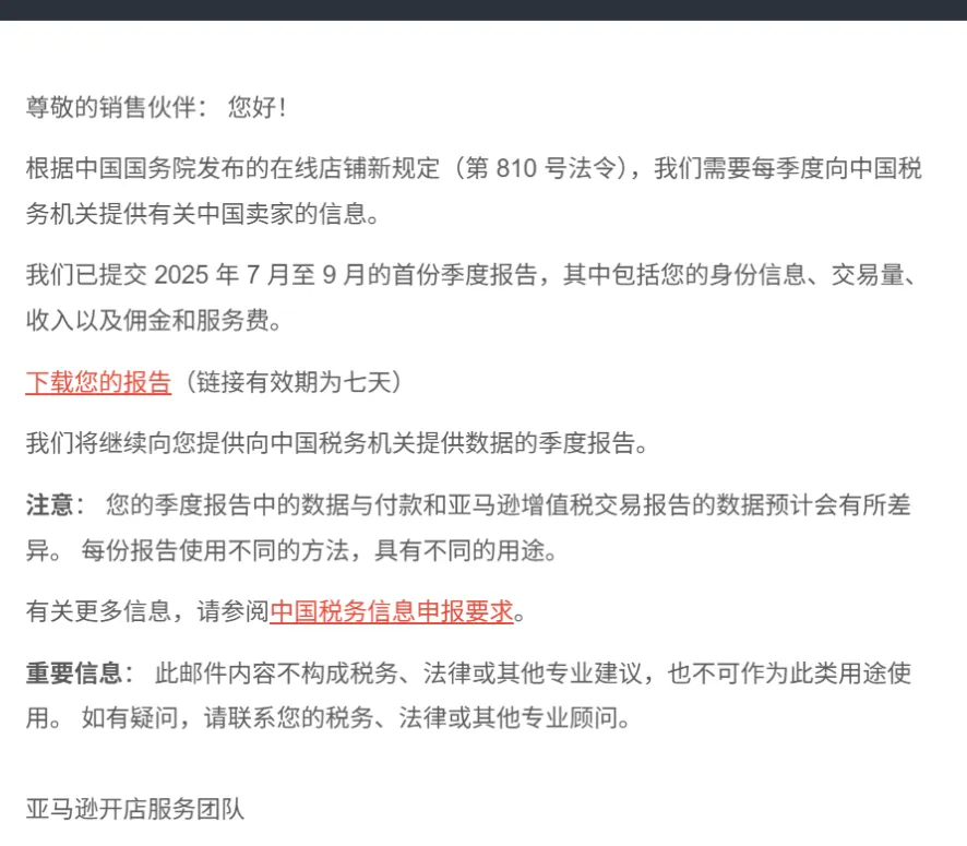 近日,不少亚马逊中国卖家收到平台推送的邮件——《View your China tax report for July-September 2025》(《查看您2025年7月至9月的中国税务报告》),同时附上了报告下载链接,卖家可查看平台向税局报送的具体信息。