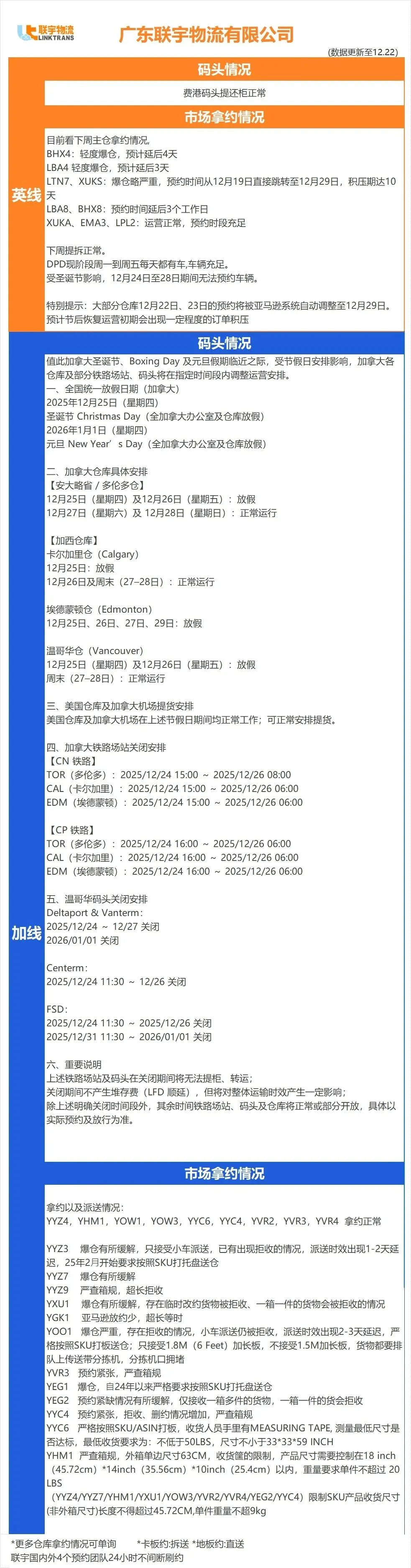 请查收亚马逊末端派送仓及港口的最新情况汇总,具体如下:(仅供参考,以仓库实际情况为准)