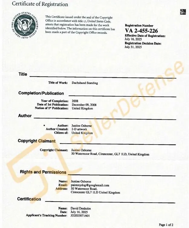 原告 Justine Osborne 是一位专业艺术家,二十多年来一直致力于狗狗肖像画创作。原告在全球范围内创作了五百多幅委托肖像画,同时还经营着一家成功的在线商店,销售额超过一万件。