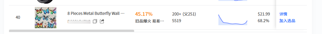 小海在上方列表中发现一款3D金属蝴蝶,虽然是普货日常产品却能应用在节日装饰场景上,在旺季表现是不错的,但淡季跨度长,虽然也能出单却达不到我的选品标准,所以我在这一步将这款产品作为锚点,去挖掘与它竞争情况相似的产品;