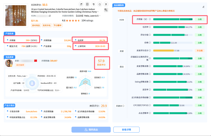 这是我用了锚点选品发现的一款同样是具备节日属性的普货产品,有着多个使用场景(日常室内外装饰、圣诞装饰、派对装饰、婚礼装饰、女生礼物等),再进一步看产品的三维数据分析也是合格的(卖家评分居中、淡季月销量合格、上架时间较新)。