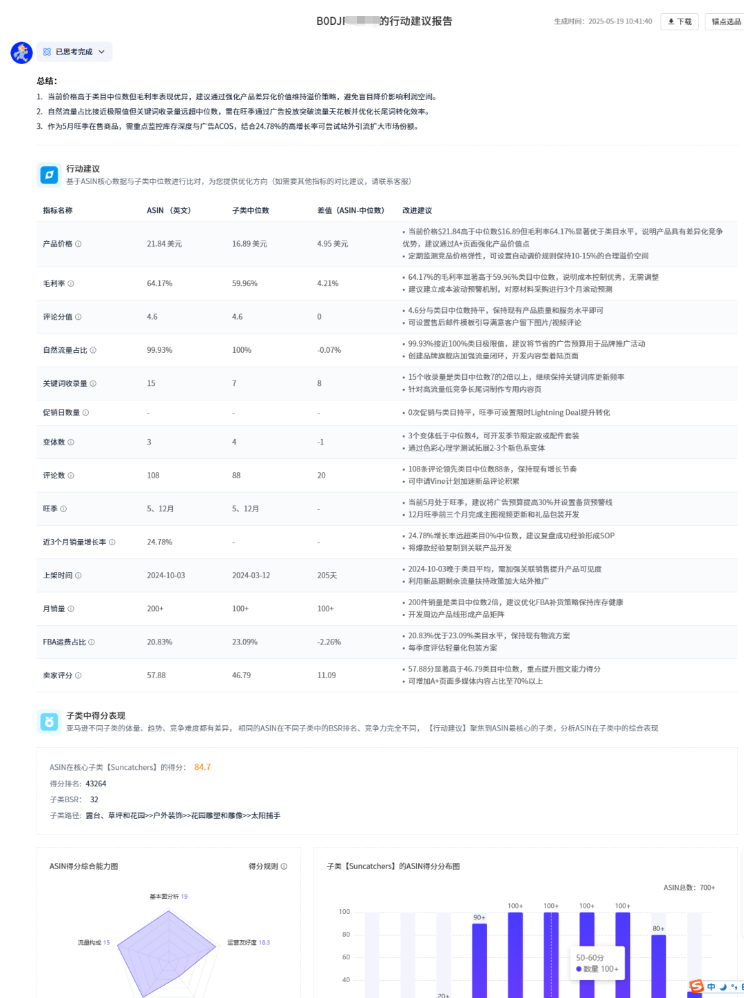 操作:输入上方ASIN→分析行动建议→查看行动建议报告