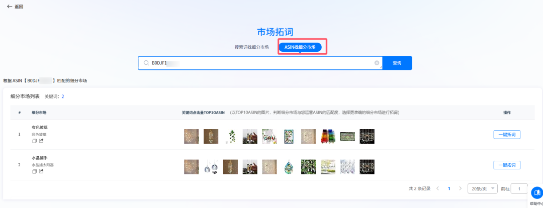 操作:输入ASIN→找到细分市场→选择匹配度更高的市场→一键拓词→收藏至词库