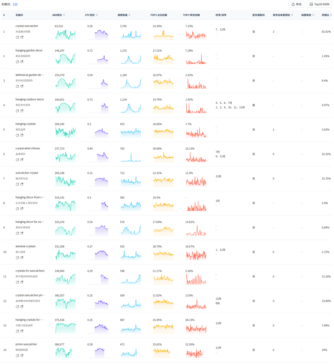 这里的关键词是根据ABA排名展示的,由此得知排名越靠前的词搜索量点击量也更高,那么竞争肯定也更高,但能不能有效转化才是我们重点关注的指标。