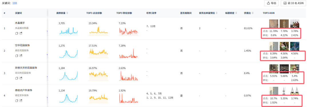 我们可以查看每个词的TOP3ASIN,下面会展示它们的点击率和转化率,能直接看到每个词的价值,这一点作为我们做选词参考是很重要的。