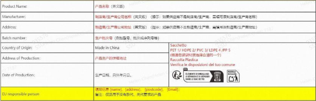 制造商/进口商或自有品牌商的信息、生产地点和日期、制造过程的细节信息(例如批号batch number)。这意味着永久识别标记(tracking label)可以是一个唯一的标识符,只有卖家/制造商/供应商才能识别所需的信息。例如,卖家/制造商/供应商可以创建任何唯一的追踪代码(unique identifier)。