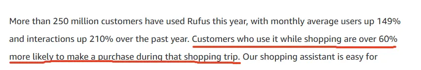 最关键的是,使用 Rufus 的买家完成购买的概率比未使用者高 60%