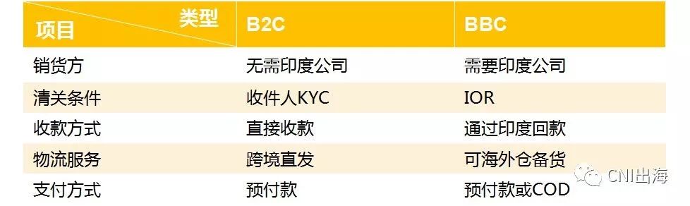 BBC即借助印度公司的壳,这是该模式必须迈过的一道门槛,要考虑到合规性。B2C跨境直发模式无需注册印度公司,可以放开手做。通过收件人的KYC清关,并且能够直接收款,中间环节少,对电商的限制更小,是比较省事的方式。缺点也是有的,一个是无法进行海外仓备货,另一个是无法COD。