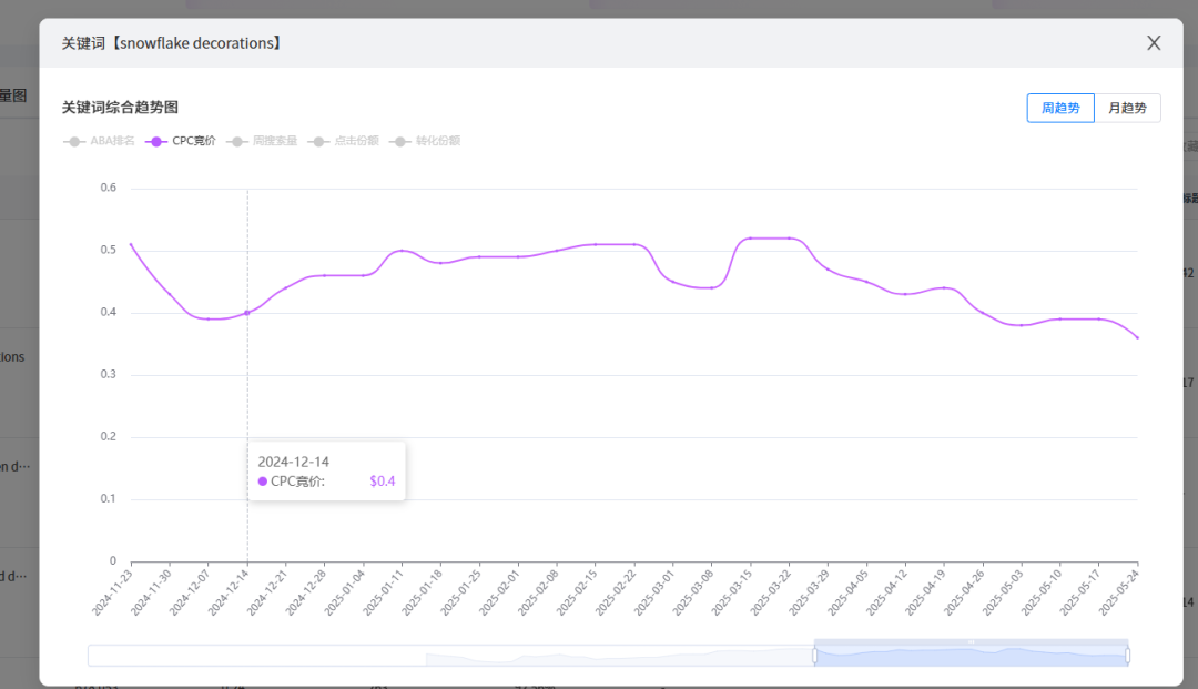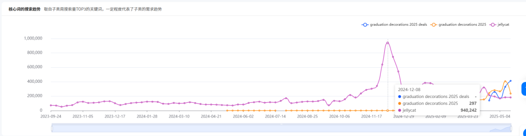 该子类市场的季节性还是很明显的,产品需求在11、12月集中爆发,1月后迅速下降;从子类的核心词(graduation decorations 2025 deals、graduation decorations 2025、jellycat)搜索趋势来看,每年的12月初是搜索最高峰;