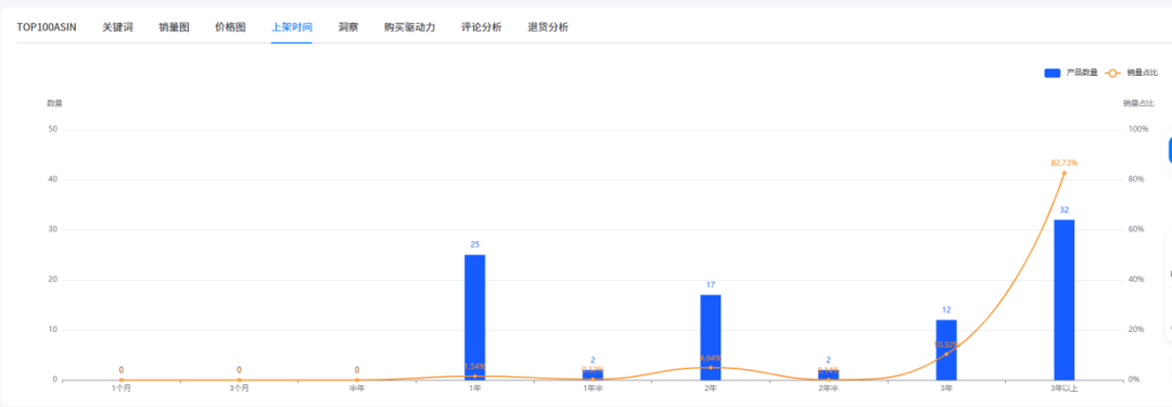 ●销量占比:根据细分市场(snowflake decorations)显示,1年内新品销量占比是1.54%;3年以上销量占比82.73%