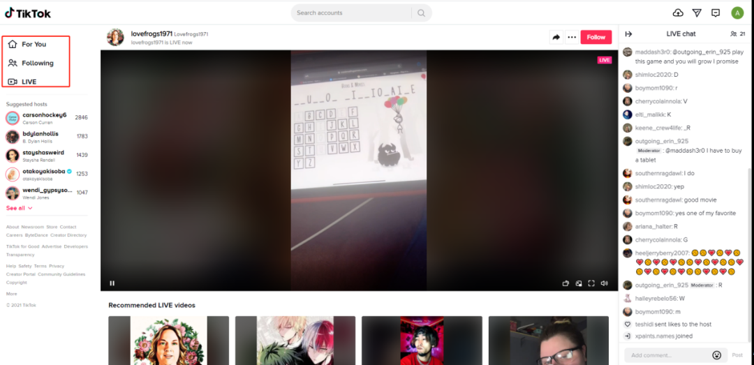 从上图可以看出,「TikTok」 PC 端直播的主画面在整个界面中央;左侧是「TikTok」向用户推荐的正在直播的主播,顺序按照当前直播间人数排序;右侧是直播间的直播聊天室;底部则是向用户展示当前全部正在直播的直播间。
