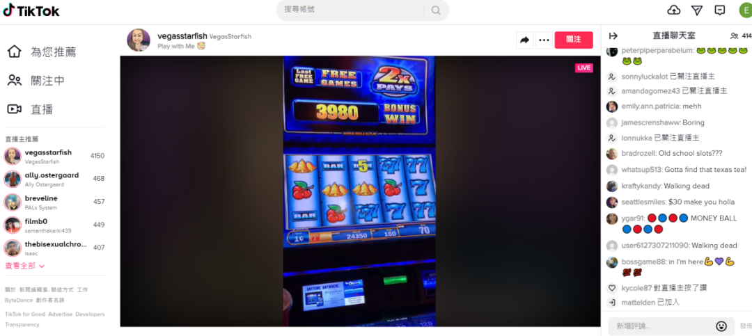 美国应该是「TikTok」 PC 端直播功能最重要的市场。笔者在北京时间下午 4:30 左右(美国时间凌晨 4 点 30 分),观察了美国 Top10 的直播间,人数最多的直播间依然有 4000+的观看人数。这场直播的主要内容是主播直播在赌场的过程,一边直播一边与观众讲话聊天。在直播过程中,观众可以向主播送出玫瑰等礼物。