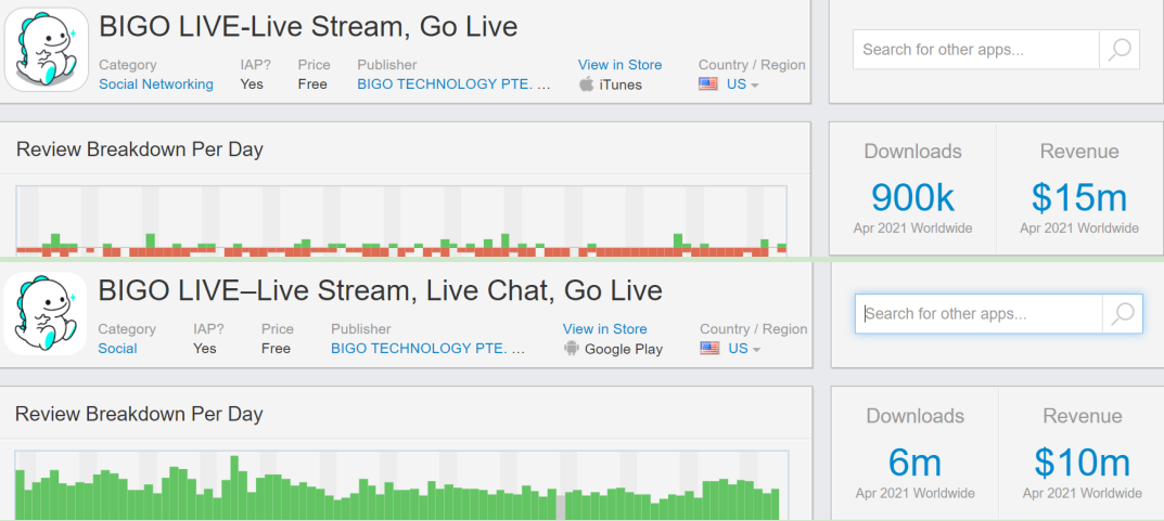 「BIGO LIVE」 iOS+Android 端的收入