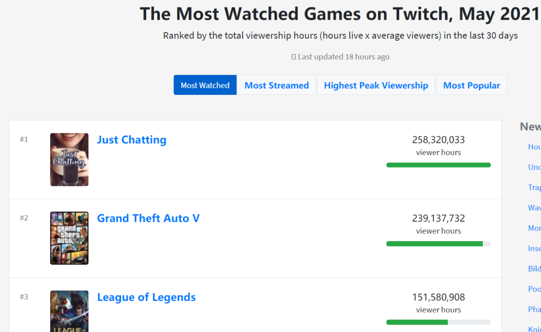 而在「Twitch」上,游戏之外的内容也在快速增长,根据数据显示,五月份 Just Chatting 频道是平台上最热门的频道。