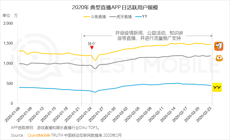 但是凭借着快手作为短视频 App 在用户量上的优势,其直播功能的用户活跃度已经超越了虎牙。根据去年 7 月快手官方公布的数据,快手直播功能的 DAU 已经超过 1.7 亿,而根据 QuestMobile 的数据显示,在 2020 年年初时,虎牙、斗鱼的日活仍在 1000~1500 万之间的水平。