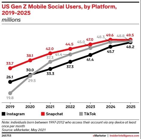 而且作为一个以短视频为主要内容形式的社交媒体,「TikTok」的活跃用户增长速度也会大于以直播为主要内容形式的「Twitch」。更重要的是,「TikTok」在吸引 Z 世代用户上的能力要比「Twitch」更强。根据 eMarketer 最近的数据预测,到 2021 年底「TikTok」所拥有的 Z 世代用户量将超过 Instagram,并且到 2023 年「TikTok」的 Z 世代用户量还将超过目前在 Z 世代用户中最受欢迎的社交平台 Snapchat。