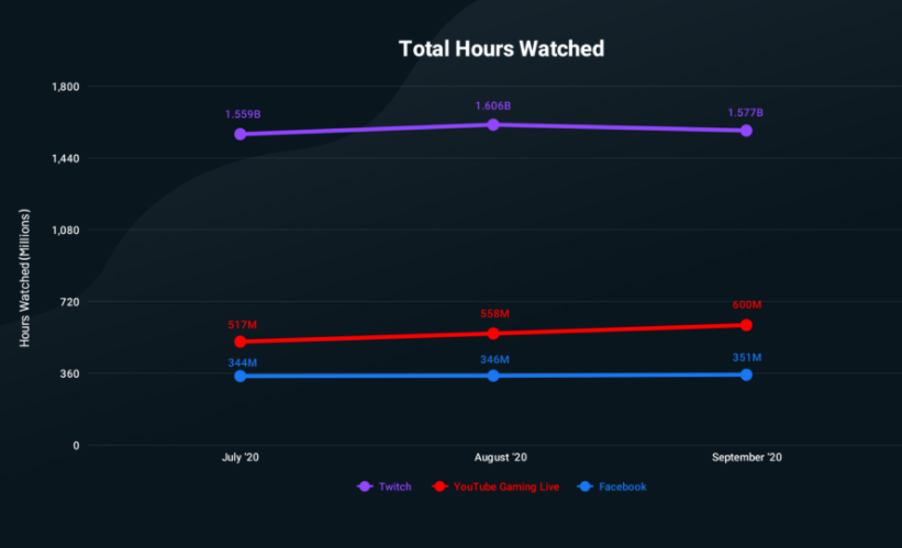 根据 streamlabs 的数据显示,在 2020 年 Q3 的三个月当中,「Twitch」的总观看时长呈现出下降状态,而 YouTube gaming 和 Facebook gaming 却处于上升的趋势。