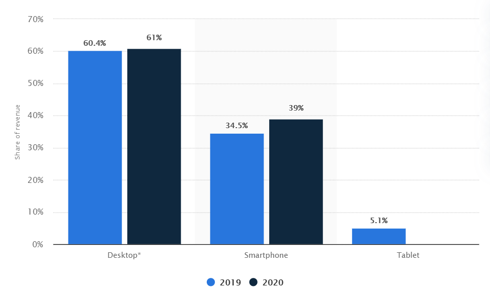 而另一方面,即使在疫情期间美国用户移动端购物的习惯正在逐渐养成,但是 PC 端购物依然是大部分美国消费者的首选。根据 Statista 的数据显示,在 2020 年购物季期间,美国各个购物渠道的收入占比中,PC 端依然以 61% 位于首位。