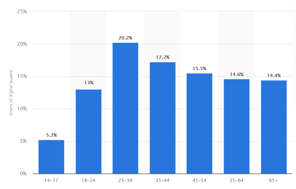 此前「TikTok」官方与沃尔玛联手举办了两场直播带货活动,从观看数据来看,两场直播的最高观看量都非常可观,但是根据此前白鲸对话的嘉宾分享,美国的「TikTok」用户对于直播带货的习惯更多还是集中于观看,而没有形成很好的直播过程中购买的意识。同样地,Instagram、Snapchat 等平台都在推电商,但直播购物转化效果并不好,根据业内人士观察,很可能跟这些平台用户年龄层小、消费水平低有关。而 Statista 的数据也能侧面证明这一点,2020 年 2 月,美国在线网购的年龄群体中,25~44 岁的人群才是主力军。