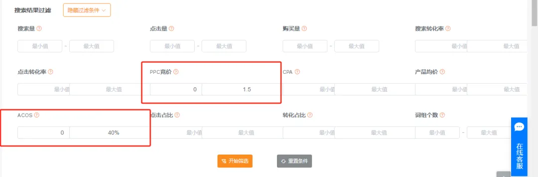 (3)筛选条件: ppc竞价<$1.5, acos<40%(蓝海指标)