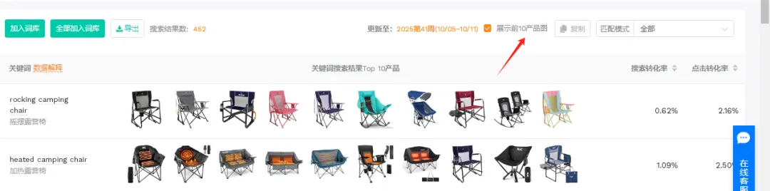勾 “展示前 10 产品图”:确认关键词和你的产品匹配,比如你卖露营椅,就排除 “folding chairs(折叠椅)” 这类不相关的词;