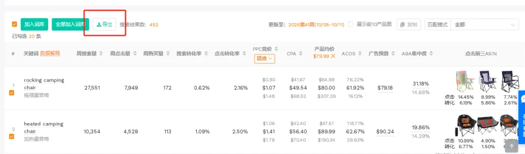 按 “周购买量” 降序:周购买量代表市场容量,优先选 100 + 的词,比如 “rocking camping chair” 周购买量 172,是核心大词;