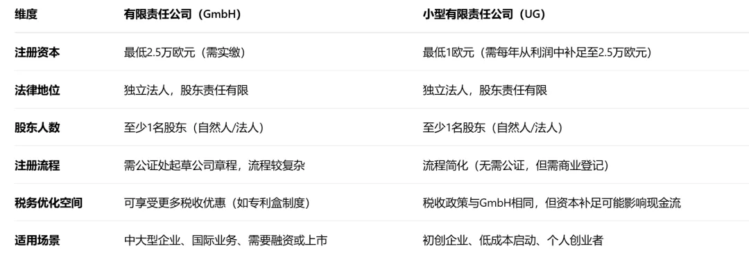 UG(小型有限责任公司):最低注册资本1欧元(需每年补足至2.5万欧元),适合初创企业或低成本启动。