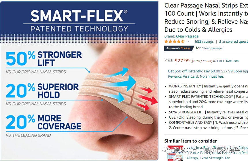 不过,后面的商家想要入场这款通鼻贴的话,会有点门槛,至少是在专利的角度有门槛。因为这款通鼻贴是存在美国外观专利的,下面展示专利图截图:
