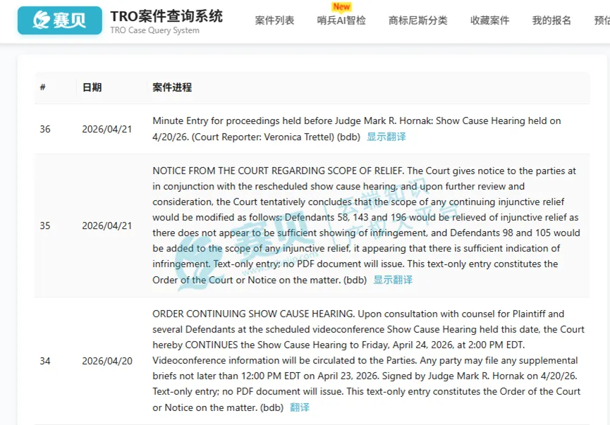 本案临时限制令(TRO)有效期至2026年4月29日。目前亚马逊平台已出现涉案店铺资金冻结、产品 Listing 全面下架、海外库存无法正常销售等情况。2026年4月 24日将召开案件听证会,本次听证会后法院大概率下发初步禁令(PI)。